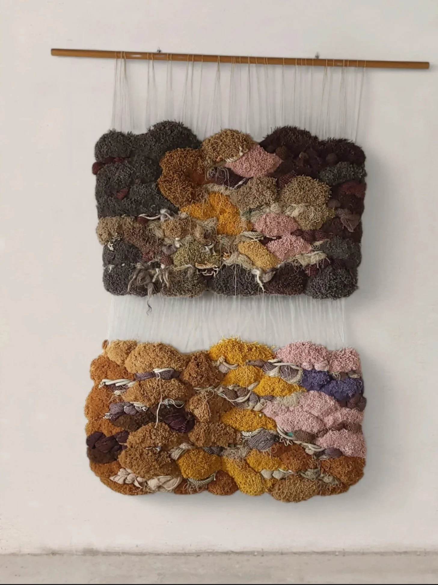 Materials: wool from different sources, acrylic, rope and recycles fishing nets.